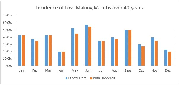 On a capital return basis, May and June do stand-out as the two months where share prices have fallen more often than risen, respectively 52% of the time in May and 58% of the time in June. Once again, when dividends are included, the picture changes for May.