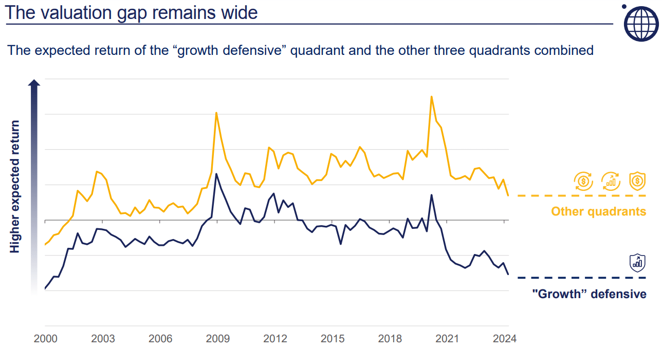 At the same time, the growth defensive quadrant also has the lowest expected return it’s ever had, Brocklebank says.