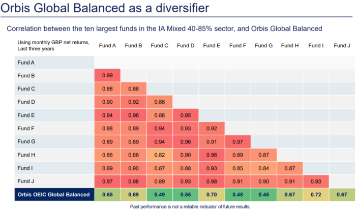 Brocklebank compares the Orbis OEIC Global Balanced Fund, which has a much smaller correlation, from 0.49 to 0.7 against the 10 largest funds.